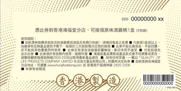 憑券到香港鴻福堂分店, 可換領有機滴雞精1盒(1盒5包, 每包60ML).