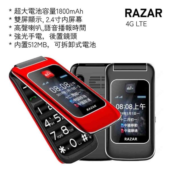 專為長者設計的Razar M99 4G翻蓋手機,融合「大字大屏大聲」三大核心功能!2.4吋高清內屏+1.8吋外屏雙顯示,搭配超大字體、物理大按鍵及3D立體環繞音喇叭,操作直覺簡單。支援4G LTE雙卡雙待、語音播報來電/短信/時間,內建1800mAh可拆式大電池及強光手電筒,安全實用。金屬質感機身,Type-C快充,行貨享1年保養!