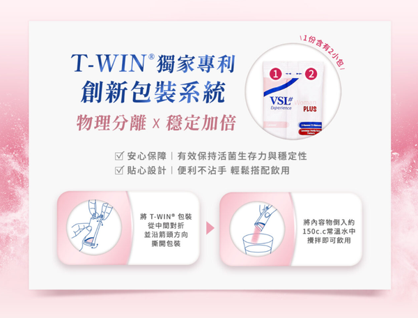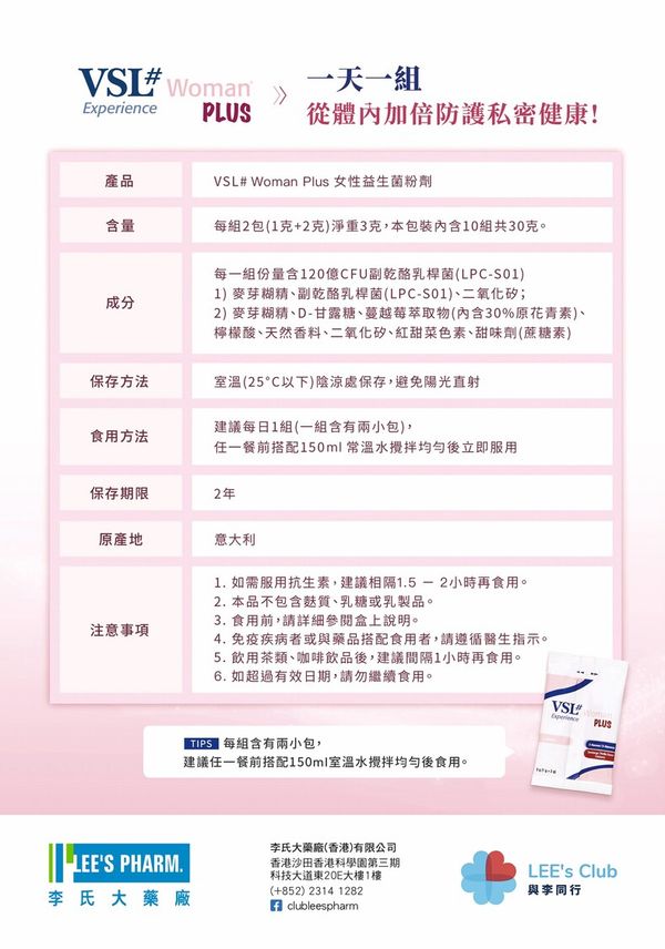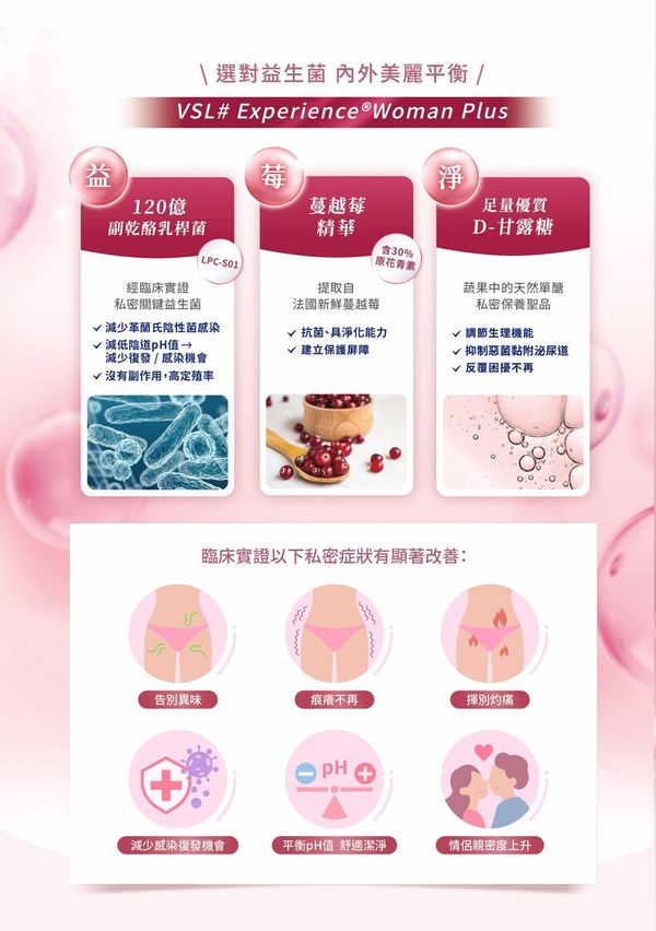 VSL#Woman PLUS 女性益生菌採用一種獨有的益生菌-副乾酪乳桿菌(L.paracasei),臨床實證可以減少革蘭氏陰性桿菌感染,減低患上細菌性陰道炎的機會,同時減低陰道的PH值,保持酸性平衡,維持陰道健康,預防泌尿道感染,全新的專利服用方法 “T-WIN stick pack”創新技術,加強副乾酪乳桿菌在體內的定殖率,擊退壞菌,加強陰道保護。而且VSL#Woman PLUS女性益生菌還添加了蔓越莓和甘露糖來有效阻止細菌依附於泌尿道上,清潔泌尿道和維持膀胱內壁健康。