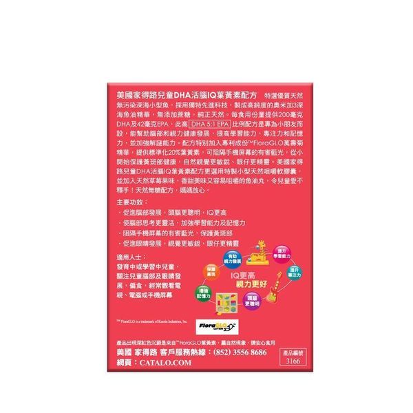 特選優質天然無污染深海小型魚,採用獨特先進科技,製成高純度的奧米加3深海魚油精華,無添加蔗糖,純正天然。每食用份量提供200毫克DHA及42毫克EPA,此高DHA5:1EPA比例配方是專為小朋友而設,能幫助腦部和視力健康發展,提高學習能力、專注力和記憶力,並加強解謎能力。配方特別加入珍貴成份™FloraGLO萬壽菊精華,提供標準化20%葉黃素,可阻隔手機螢幕的有害藍光,從小開始保護黃斑部健康,自然視覺更敏銳、眼仔更精靈。美國家得路兒童DHA活腦IQ葉黃素配方更選用特製小型天然咀嚼軟膠囊,並加入天然草莓果味,香甜美味又容易咀嚼的魚油丸,令兒童愛不釋手!天然無糖配方,媽媽放心。