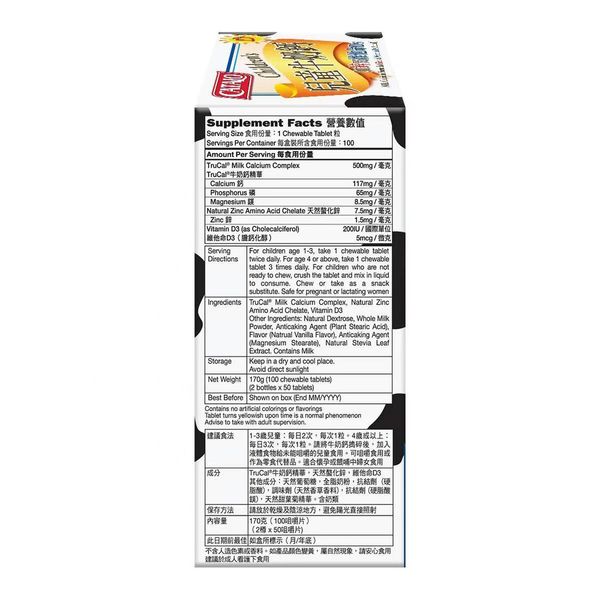 TruCal®牛奶鈣精華,天然螯化鋅,維他命D3 其他成分:天然葡萄糖,全脂奶粉,抗結劑 (硬脂酸),調味劑 (天然香草香料),抗結劑 (硬脂酸鎂),天然甜葉菊精華。含奶類