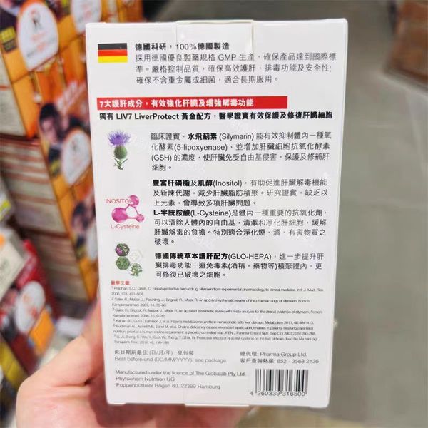德國傳統草本護肝配方(GLO-HEPA),進一步提升肝臟排毒功能,避免毒素(酒精, 藥物等)積聚體內,更可修復已破壞之細胞。