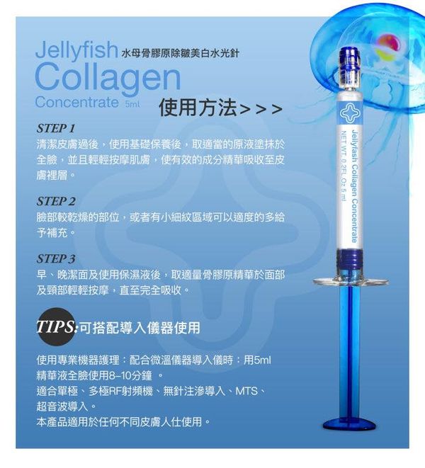 塗抹式既膠原蛋白!一句講晒,即滑!保濕+緊緻+白滑係即時俾到您!仲要1支5ml咁多,可以分4-5次用(份量比一般水光針多1倍),如果有導入機就用晒成支黎導入,效果一流,比起去美容院做facial 有過之無不及,而且唔起膠唔起碎(因為份子細直吸肌底),妝前用貼貼服服,輪廓出晒黎!水母系列適合任何膚質包括敏感肌都用得,一於試下佢,唔會後悔!
