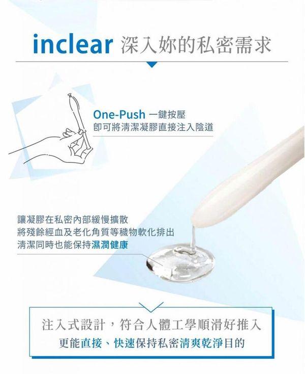 Inclear私密清潔保濕凝膠設計符合人體工學,成分以純化水作為基礎,加以玻尿酸、甘油及羥乙基纖維素作保濕及淨化功用,為女性私密處帶來更好的保護屏障,除了可單獨使用外,更可配合Silk'n Tightra 私密護理儀器使用。