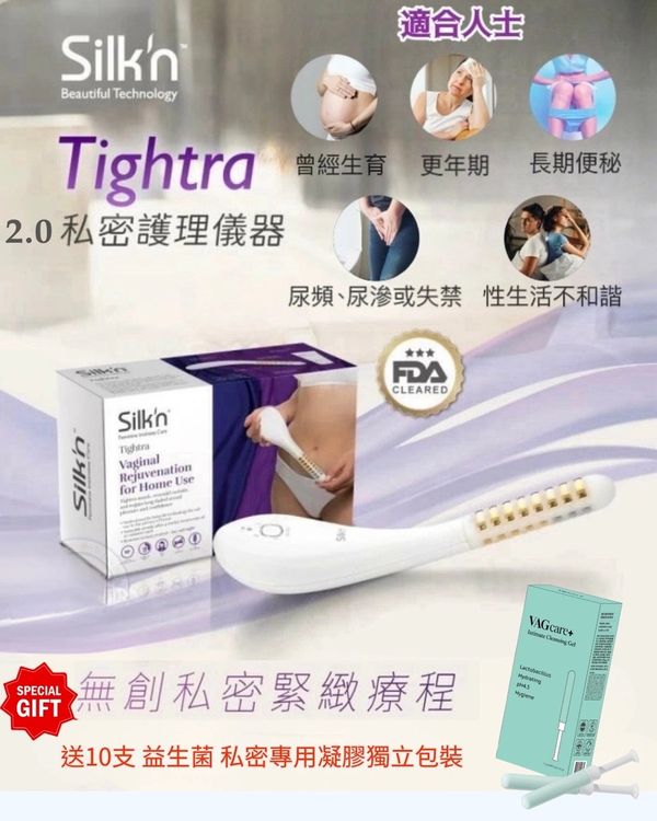 分娩或荷爾蒙變化(如更年期)後,女性的私密處 會看起來和感覺不同。改善女性在結婚生小孩後或 隨住年齡漸長,私密處變得鬆弛和敏感度下降,還會 有尿滲等問題。革命性的Silk'n Tightra採用臨床測試 和驗證的雙極射頻能量,能夠緩解這些症狀,而無 需動手術去治療。 Silk'n Tightra 私密護理儀器是首部經臨床實證的家用 女性收陰機。利用雙極射頻技術,能量均衡慘入真 皮層,同步修護內外陰,重建膠原,收緊內部組 織,令你重拾年輕的觸覺,尋回幸福的生活。它還 能幫助婦女解決盆底肌肉衰弱而引起的問題。