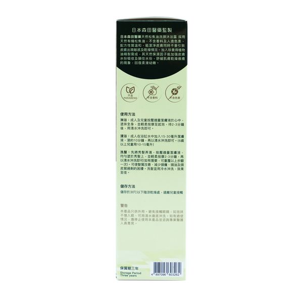 日本森田醫藥天然松焦油洗頭沐浴露 採用天然有機松焦油,不含香料及人造色素, 配方性質溫和,能潔淨皮膚同時不會引致皮膚出現敏感及乾燥情況。加入珍貴植物油精製而成,其天然保濕因子能加强皮膚水份吸收及鎖住水份,舒緩肌膚乾燥痕癢的現象,回復柔滑幼嫩。