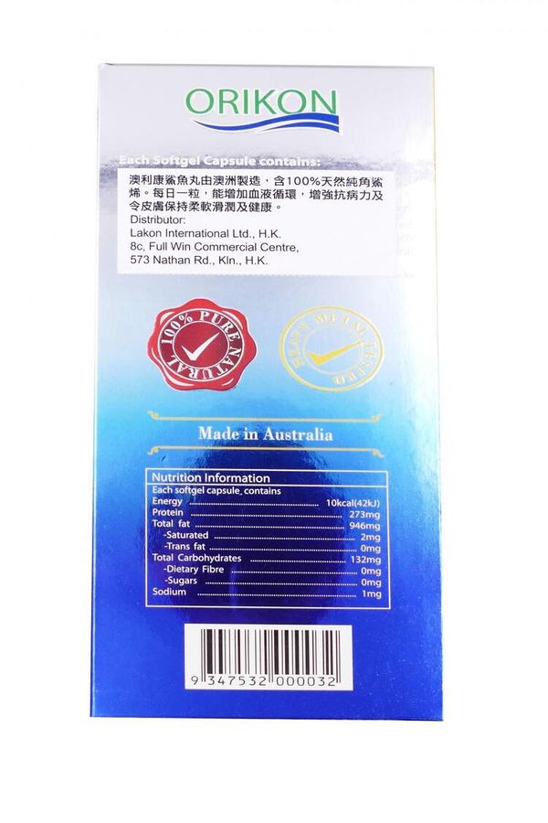 澳利康鯊魚丸由澳洲製造,含100%天然純角鯊烯。每日一粒,能增加血液循環,增強抗病力及令皮膚保持柔軟滑潤及健康。