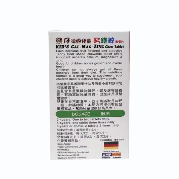 本營養品具香甜果汁味及可愛小熊形狀可吸引兒童喜爱。並且含有重要礦物質鈣、鎂及鋅等營養。有助鞏固兒童骨質、促進成長及整體健康。兒童在日常飲食中,並不易攝取足夠鈣、鎂、鋅礦物質,本配方可提供有用營養補充品,幫助兒童健康快高長大。