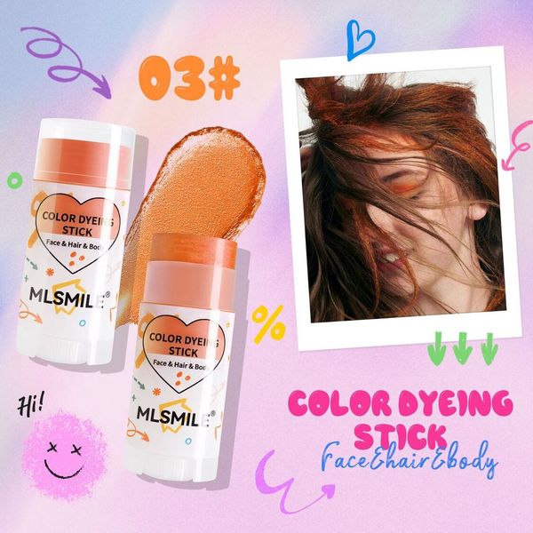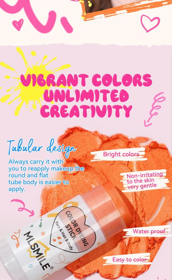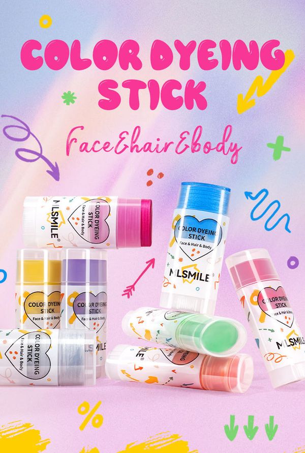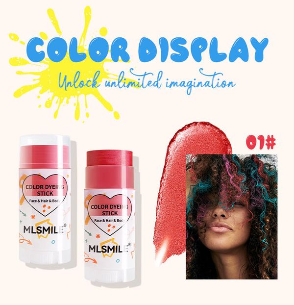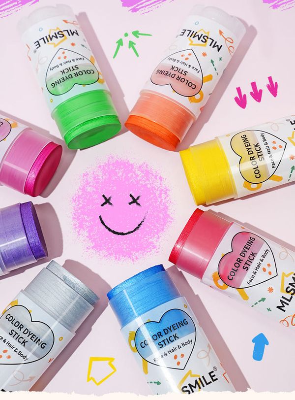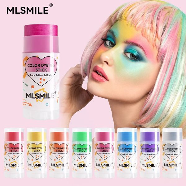 MLSMILE 8 色染发棒标示可用于面部、头发和身体 。 用于脸部时,能当作创意彩妆,打造独特妆容; 用于头发,可实现局部或整体的色彩变换,轻松打造个性发色,为造型增添亮点。