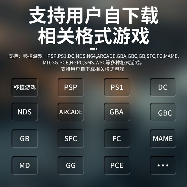 遊戲:"支援:移植遊戲,PSP,PS1,DC,NDS,N64,ARCADE,GBA,GBC,GB,SFC,FC,MAME,MD,GG,PCE,NGPC,SMS,WSC等多種格式遊戲。支援用戶自下載相關格式遊戲"