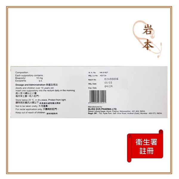 成年人及10歲以上小童:每天早上使用1枚10mg塞劑
