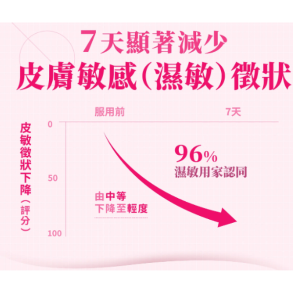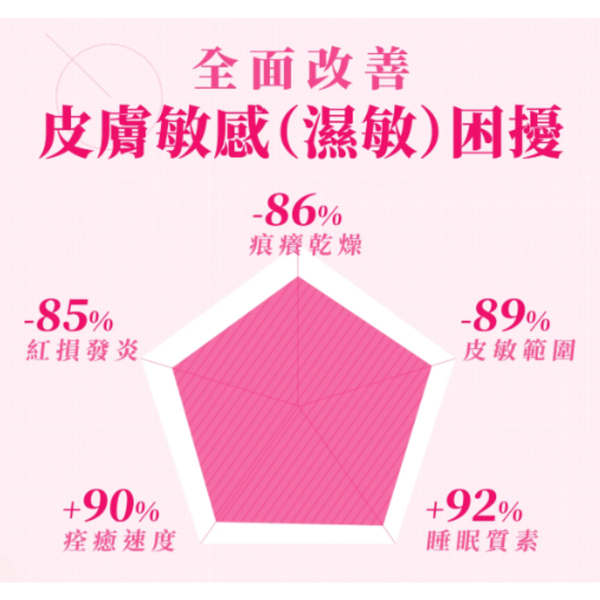 ・改善皮膚敏感徵狀 (包括止痕、红、腫、熱及疼痛情況); 降低臨床濕敏指數(SCORAD)