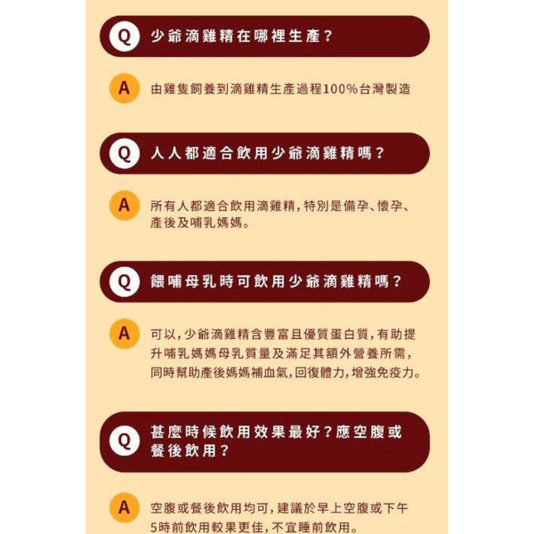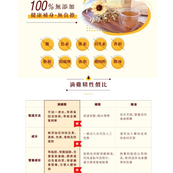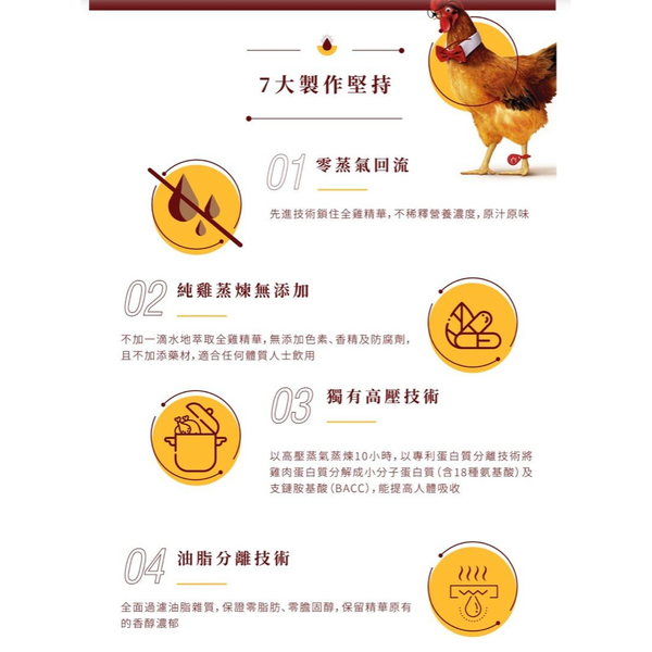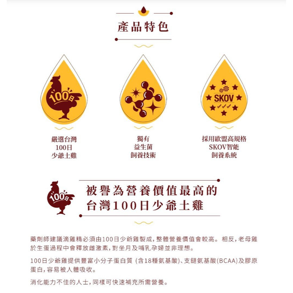 少爺滴雞精嚴選100日台灣少爺土雞,由註冊藥劑師監製,確保飼養環境衛生和雞隻健康。 走地飼養100日的少爺土雞,未被絕育的幼嫩雄性土雞,不含雌激素、不燥熱,確保不打生長激素及抗生素,並以益生菌餵飼,強化雞隻腸道及免疫力。 採用零蒸氣回流技術,絕不添加一滴水,萃取雞隻精華,口味濃郁甘香,蘊含豐富氨基酸、膠原蛋白 (透過專利技術,確保膠原蛋白完整吸收形態)、蛋白質、零脂肪、零膽固醇,是孕婦、坐月媽媽的補身恩物。小朋友、成年人、長者飲用後,提神醒腦、精力充沛和增強免疫力。 多項檢驗報告,確定産品質素及安全性,更有保障