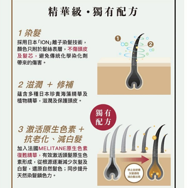 不含12大致敏成分,透過日本先進「ION」離子護染技術,顏色只附於髮絲表層,不傷頭皮及髮芯,避免傳統化學染髮劑帶來的傷害,同步「染髮 + 護髮」,更加入「激活原生色素再生」精華,逆轉頭髮老化、同步減少白髮再生,針對性提升 ----
