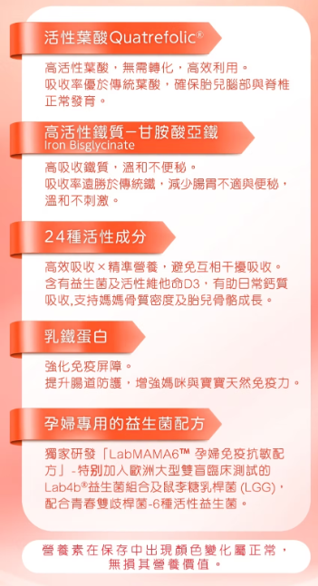 活性葉酸 Quatrefolic®、乳鐵蛋白、 LabMAMA6TM 孕婦免疫抗敏益生菌配方配方、甘胺酸亞鐵、多種維他命(B1、 B2、B3、B6、B12 、 C 、 D3 、 E)、礦物質、泛酸、生物素、鎂、鋅、碘、膽鹼、硒