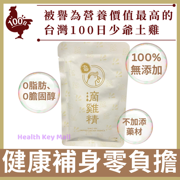 少爺滴雞精嚴選100日台灣少爺土雞,由註冊藥劑師監製,確保飼養環境衛生和雞隻健康。 走地飼養100日的少爺土雞,未被絕育的幼嫩雄性土雞,不含雌激素、不燥熱,確保不打生長激素及抗生素,並以益生菌餵飼,強化雞隻腸道及免疫力。 採用零蒸氣回流技術,絕不添加一滴水,萃取雞隻精華,口味濃郁甘香,蘊含豐富氨基酸、膠原蛋白 (透過專利技術,確保膠原蛋白完整吸收形態)、蛋白質、零脂肪、零膽固醇,是孕婦、坐月媽媽的補身恩物。小朋友、成年人、長者飲用後,提神醒腦、精力充沛和增強免疫力。 多項檢驗報告,確定産品質素及安全性,更有保障