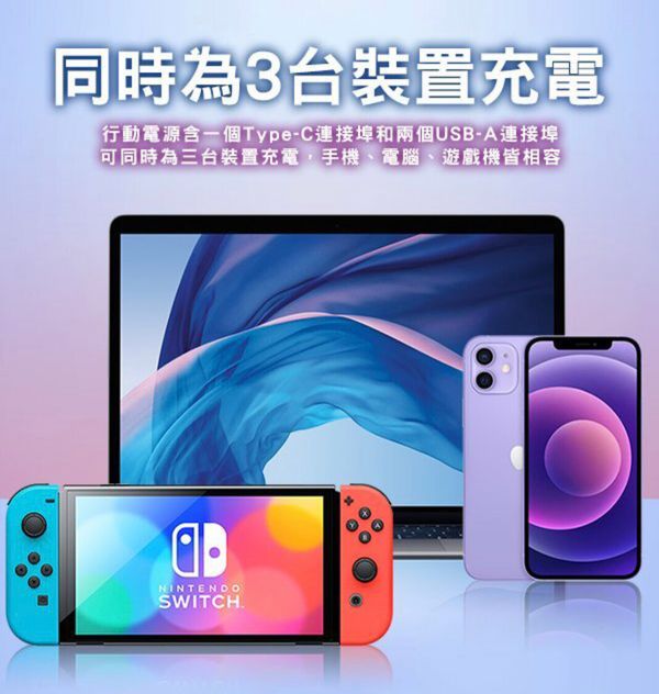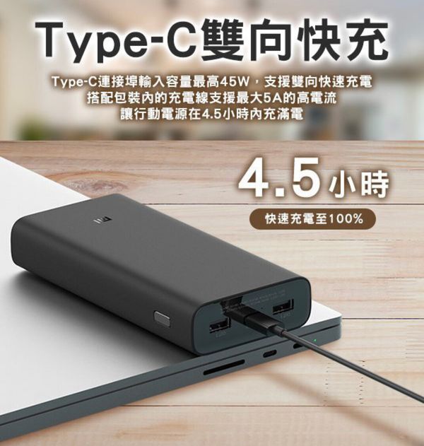大容量行動電源, 三口輸出,可同時為三台裝置充電 支持小電流充電,大到電腦、小到耳機,手環,Type-C雙向快充,搭配45W充電頭及内附充電 線,4.5小時快速充滿電 高品質芯片及多重電路保護,使用安心安全