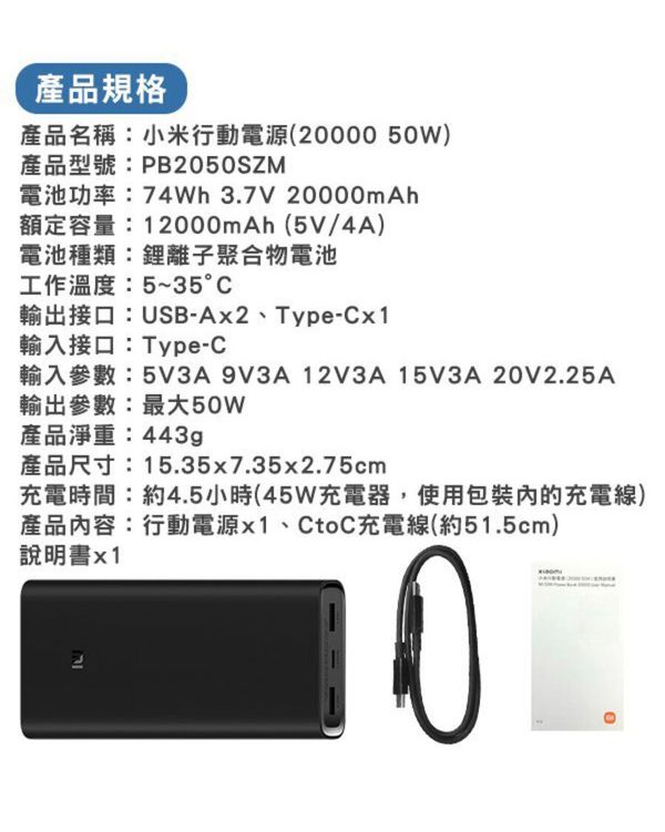 小米-小米移動電源 充電寶20000mah 50W PB200SZM 一年保養