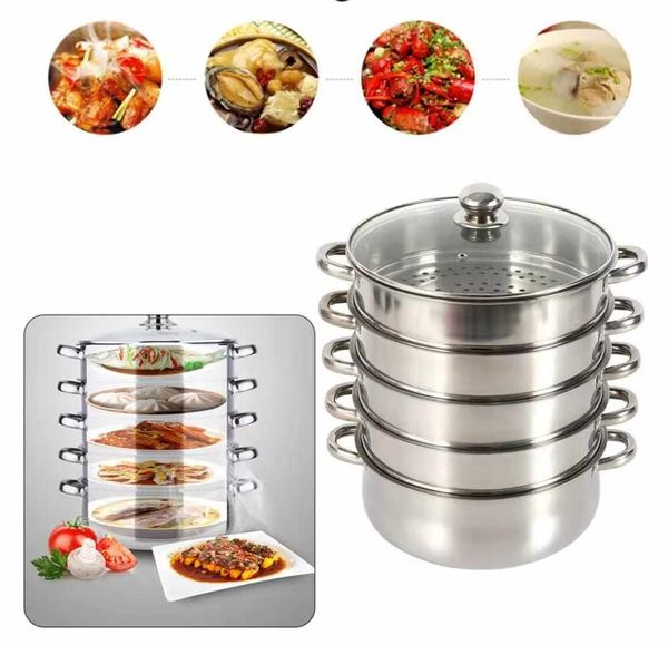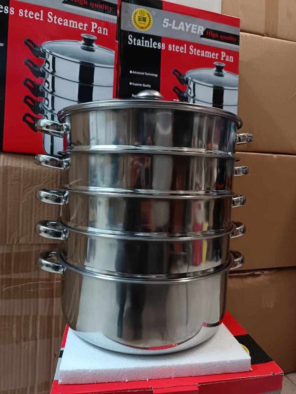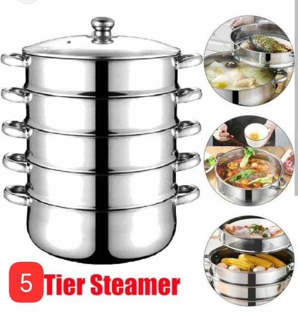 5 層 32 公分蒸籠。材質:不鏽鋼。相容於電磁爐/電爐/瓦斯爐。包括玻璃蓋。