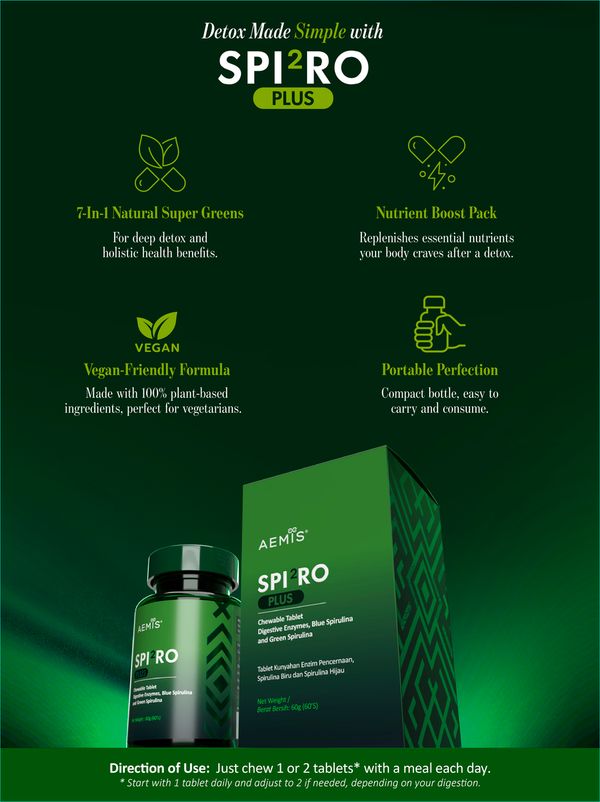 Spiro Plus 係 Wellous 出品嘅天然排毒酵素營養補充品,結合藍綠螺旋藻、小球藻、菠菜粉,加埋專利消化酵素 DigeSEB™,主打 排毒、清腸、提升免疫力。