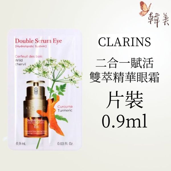 CLARINS 全新賦活精華眼霜 2 In 1,糅合眼精華及眼霜,蘊含破天荒 Double明眸配方- 有機法國峨蔘萃取,令眼周年輕蛋白激增119%2,有效減淡皺紋,緊緻眼周肌膚; 而另一超級成分薑黃,則發揮5大細胞修護功效— 再生、滋養、保濕、活氧及防禦, 24小時3保濕,撫平乾紋、改善黑眼圈,大大加強眼霜功效。100% 女性認同7天1減淡皺紋、黑眼圈、滋潤修護。 獨特雙管設計,專為眼周輪廓研發,以完美親膚黃金比例注入2: 1 的精華+眼霜,令各種亮眼精萃更易吸收,且質地輕盈不黏膩,讓妳感受眼霜的滋潤同時擁有精華的緊緻效果。立即展開7天「Double激活亮眼之旅」,迎接妳的年輕明眸。