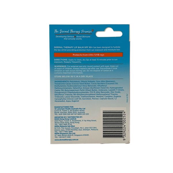 [產品特性]Dermal Therapy防曬保濕潤唇霜,蘊含獨特”尿素 + 防曬” 配方,除2.5%尿素可以去死皮補充水份,更含有 7種防曬成份,SPF指數高達50+。強效配方可抵禦 UVA/UVB 射線,特別適合戶外運動,行山時候用。