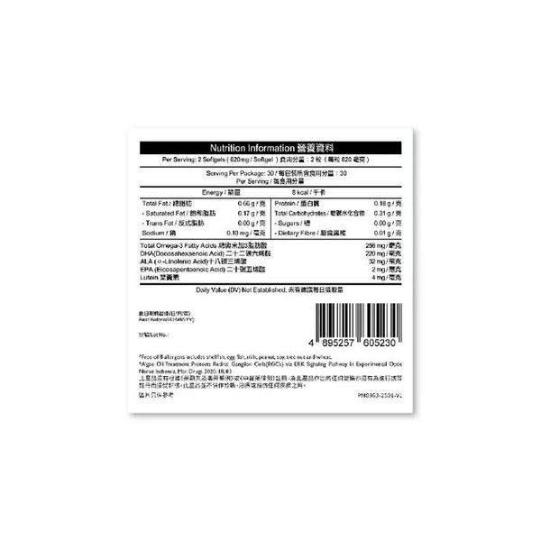 天然藻油精華(含DHA二十二碳六烯酸及EPA二十碳五烯酸)、明膠、水份保持劑E422、甜味劑E967、亞麻仁油、乳化劑E471、穩定劑E965、澱粉、抗結劑E460 (i) 、天然香橙香料、萬壽菊提取物(含專利葉黃素)、甜味劑E955、酸度調節劑E330