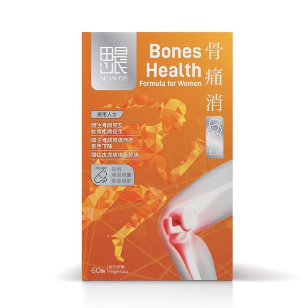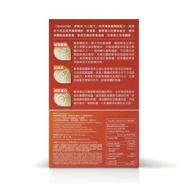 SEASONS骨痛消-女士配方採用專業藥劑師配方,其成份天然及採用葡萄糖胺、軟骨素、膠原蛋白的黃金組合,提供骨關節組織營養,修復受損的軟骨組織,改善退化性骨關節。