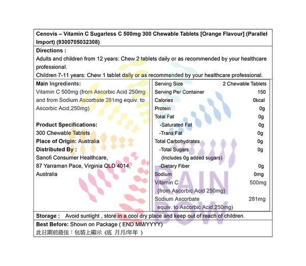 維生素 C 500 毫克(來自抗壞血酸 250 毫克和抗壞血酸鈉 281 毫克,相當於抗壞血酸 250 毫克)