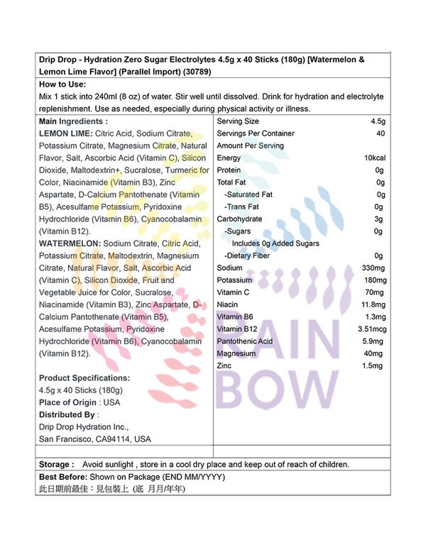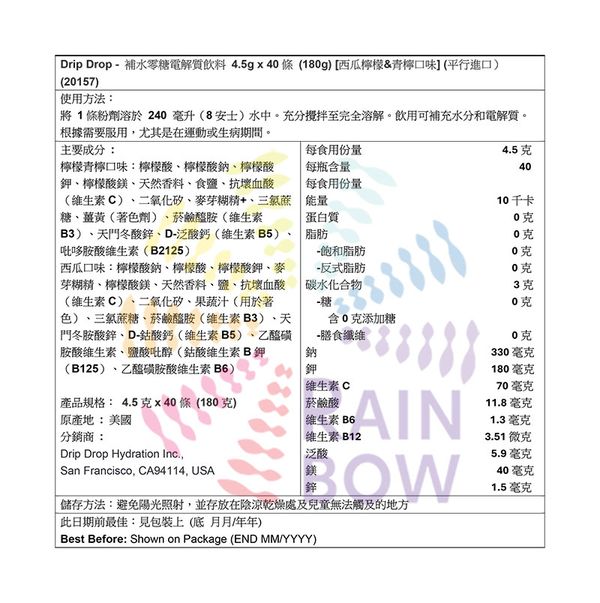 分銷商 : Drip Drop Hydration Inc., San Francisco, CA94114, USA
