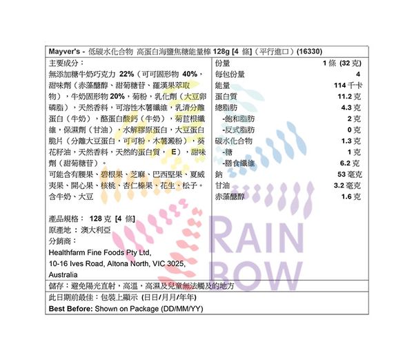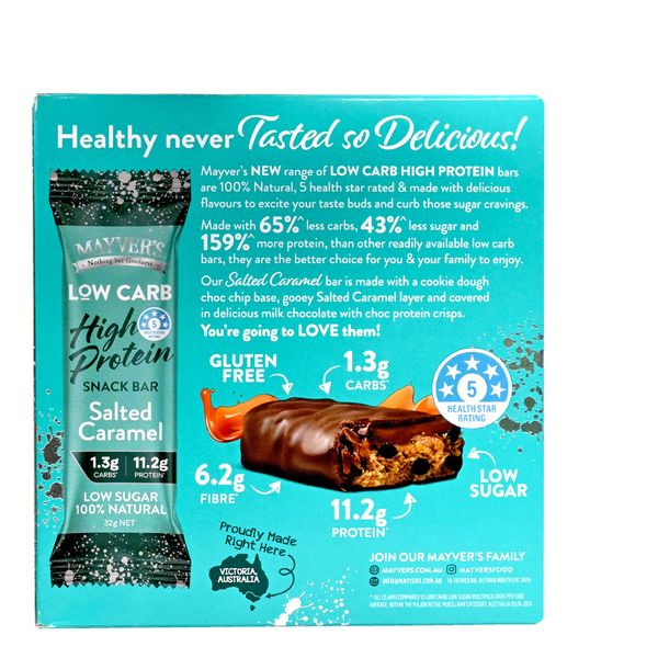 我們的 Mayver's低碳水化合物 高蛋白海鹽焦糖能量棒,以曲奇麵團朱古力碎為基底,包裹一層黏稠的海鹽焦糖,再裹上一層美味的牛奶朱古力和朱古力蛋白脆片。與其他市面上常見的能量棒相比,這款棒的碳水化合物含量降低了 65%,糖含量降低了 43%,蛋白質含量則增加了 159%,是您和家人享用美食的最佳選擇!