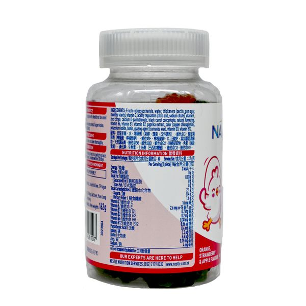 配料:低聚果糖、水、增稠劑(果膠、瓊脂、改性澱粉)、維他命C、酸度調節劑(檸檬酸、檸檬酸鈉)、維他命E、檸檬酸鋅、D-泛酸鈣、黑胡蘿蔔濃縮物、天然調味劑、維他命B6、維他命B1、維他命B2、辣椒提取物、色素(葉綠素銅)、碘化鉀、生物素、上光劑(巴西棕櫚蠟)、維他命D3、維他命B12。