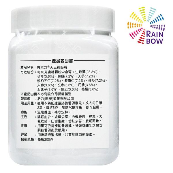 生地黃, 人參, 玄參, 丹參, 茯苓, 五味子, 遠志,桔梗, 歸身, 天冬, 炒柏子仁, 酸棗仁, 麥冬