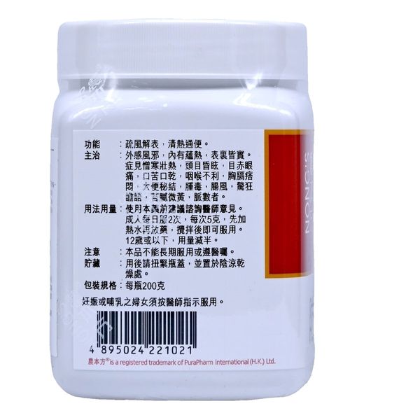 大黃、川芎、桔梗、梔子、滑石、甘草、生薑、當歸、白朮、白芍、石膏、芒硝、荊芥、薄荷、連翹、防風、麻黃、黃芩