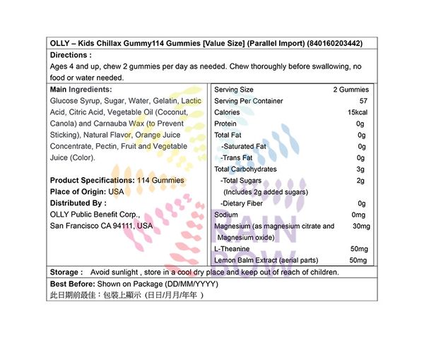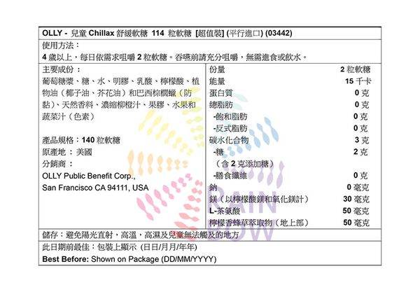 分銷商 : OLLY Public Benefit Corp., San Francisco CA 94111, USA