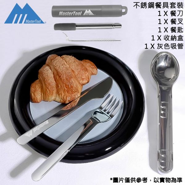 MasterTool-304不銹鋼便攜餐具套裝(包括匙羹 + 餐叉 + 餐刀+灰色收納盒+灰色吸管) 環保 耐用 安全物料 耐熱 辦公室自備餐具套裝