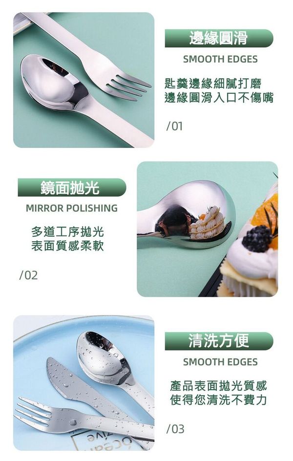 304 食品級不銹鋼餐具材質,輕盈,耐腐蝕性高,持久耐用,無磁性,且結實。且可以重複使用。