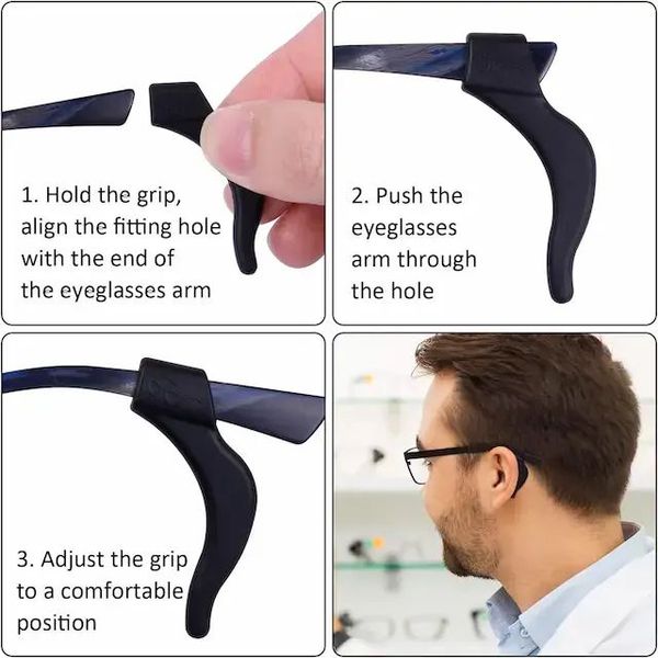 【輕鬆調整】柔軟的眼鏡固定器和掛鉤可以輕鬆調整眼鏡框上的位置和角度,矽膠掛鉤可以緊緊固定您的眼鏡,因此您無需擔心眼鏡掉落,也不會施加壓力在您的眼鏡或耳朵上。