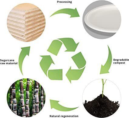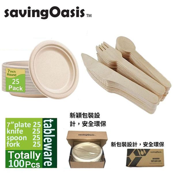 SavingOasis 環保餐具,表面光潔:紙碟-食品級甘蔗漿材質製成,木制餐具-100%天然樺木製成,堅固,光滑,無毛刺,硬度好,可生物降解,材質安全環保。在自然環境作用下最後回歸自然,不對環境生產污染。