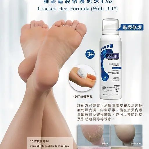 Footlogix將醫學美容級成份配方首創以革命D.I.T.(Dermal Integration Technology)專利技術泡沬快速直接滲透肌膚,乾爽舒適,有別於傳統護足產品以封閉式包覆所帶來油膩不易吸收的方式。