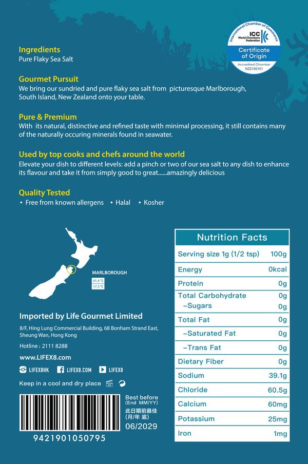天然雪花海鹽來自風景如畫的新西蘭南島瑪爾堡無塑膠粒的經陽光日曬結晶而成,蘊含多種天然礦物質,被稱為「百味之王」。海鹽成薄片,入口即溶,可搭配任何食材,美味提鮮,從海岸帶到您的餐桌上。