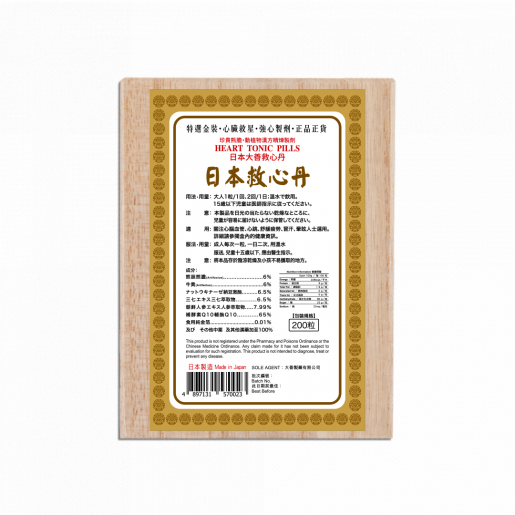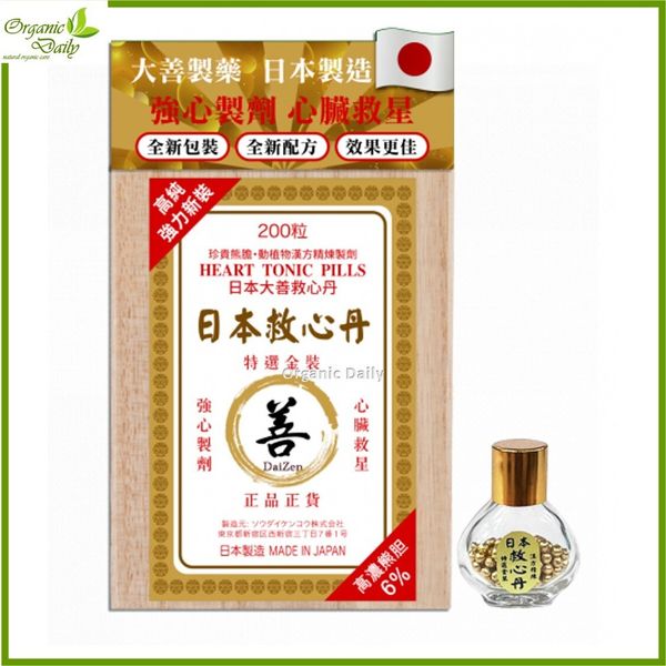日本大善救心丹由熊膽、牛黃、納豆激酶、三七、人參、輔酶Q10、食用純金箔配製而成,有助強心寧神、益氣活血、胸悶眩暈、改善心悸、疲乏無力。