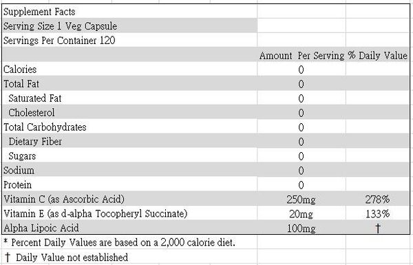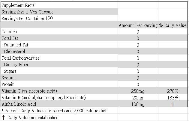 其他成分:米粉、羥丙甲纖維素(纖維素膠囊)、硬脂酸(植物來源)、抗壞血酸棕櫚酸酯和二氧化矽。
