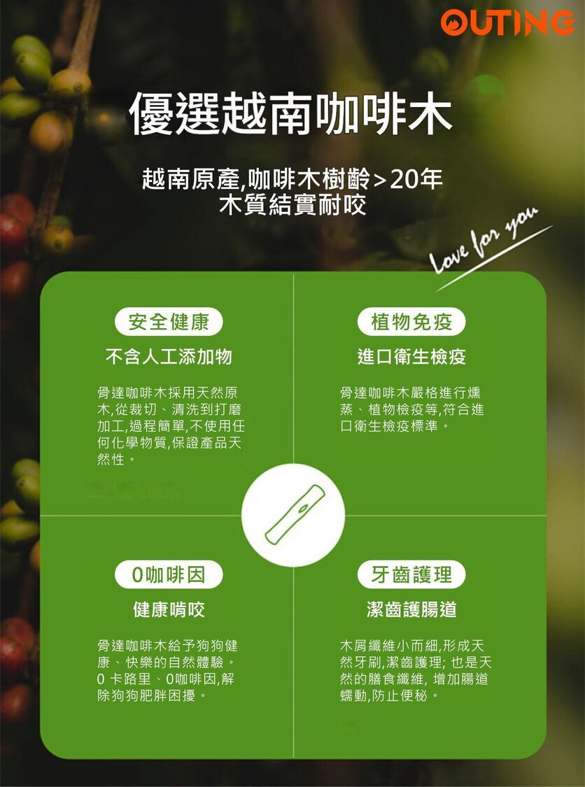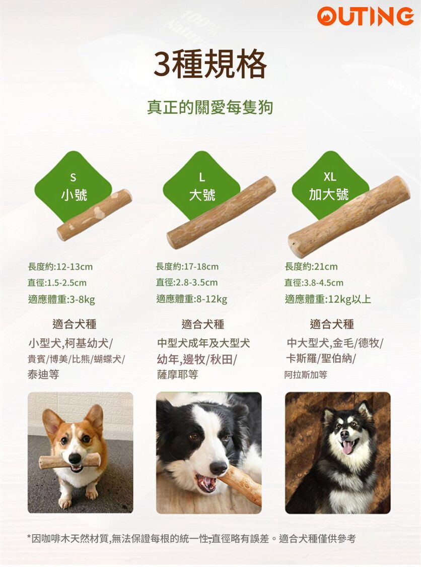 🌟由咖啡木等天然材料製成,安全且耐咬 🌟木棒上的細小纖維有助清除牙垢,減少牙石和口臭 🌟無添加有害化學物質,安全無毒 🌟狗狗在咀嚼的同時,還能獲得娛樂,減少焦慮 小號:適合小型犬 大號:適合中型犬及大型犬 加大號:適合中大型犬 *圖片僅供參考,一切以實物為準*