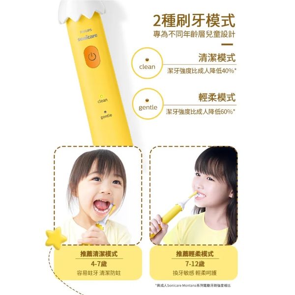 加入音波動力的兒童刷牙程序,能發揮極致清潔效果 飛利浦 Sonicare 2100 For Kids 兒童成長系列電動牙刷專為 4 歲以上兒童設計, 同時搭載音波震動技術,可徹底清除牙菌斑,並提供樂趣無窮的配件,為孩子奠定良好的刷牙習慣,一輩子受用無窮。