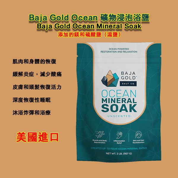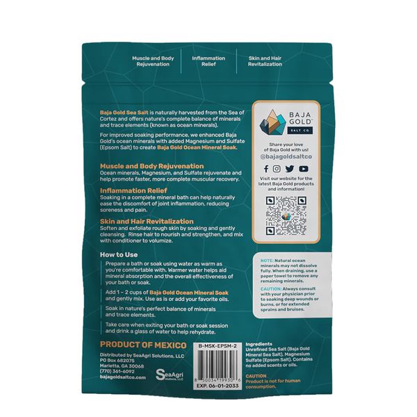 Baja Gold 海鹽是從科爾特斯海自然收穫的,提供自然界礦物質和微量元素(稱為海洋礦物質)的完全平衡。我們將這些強大的海洋礦物質與添加的鎂和硫酸鹽(瀉鹽)配對,打造出Baja Gold Ocean Mineral Soak!