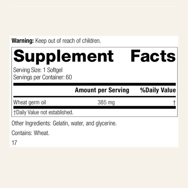 每份(1 粒軟膠囊)含有:385 毫克小麥胚芽油。其他成分:明膠、水和甘油。包含:小麥。