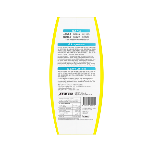 ReSlim™ 細胞級代謝激活配方 (絞股藍萃取物、非洲芒果籽萃取物、 茶花萃取物、益生菌(比菲德氏菌BB536)、黑薑萃取物、玉米鬚萃取物、白芸豆萃取物、五層龍萃取物)、增稠劑(澱粉、水解澱粉)、植物膠囊(羥丙基甲基纖維素)、抗結劑(硬脂酸鈣、二氧化矽)、食用色素 (二氧化鈦)