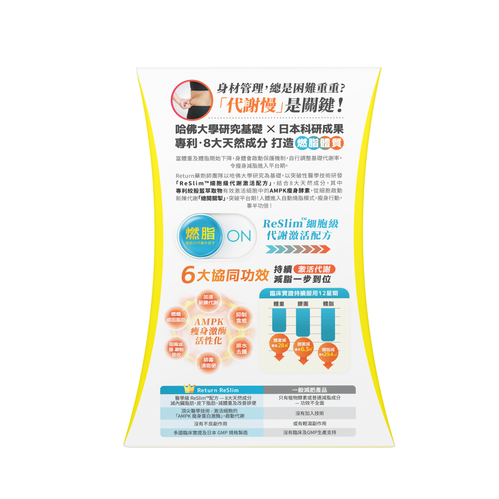 藥劑師團隊透過哈佛大學研究基礎,以突破性頂尖醫學技術,製定了「細胞級代謝激活配方」,有效激活細胞的 「AMPK 瘦身酵素」,真正從細胞根源啟動新陳代謝「總開關掣」,令體內脂肪自然進入「減脂模式」,讓各方面的減脂行動變得事半功倍 !