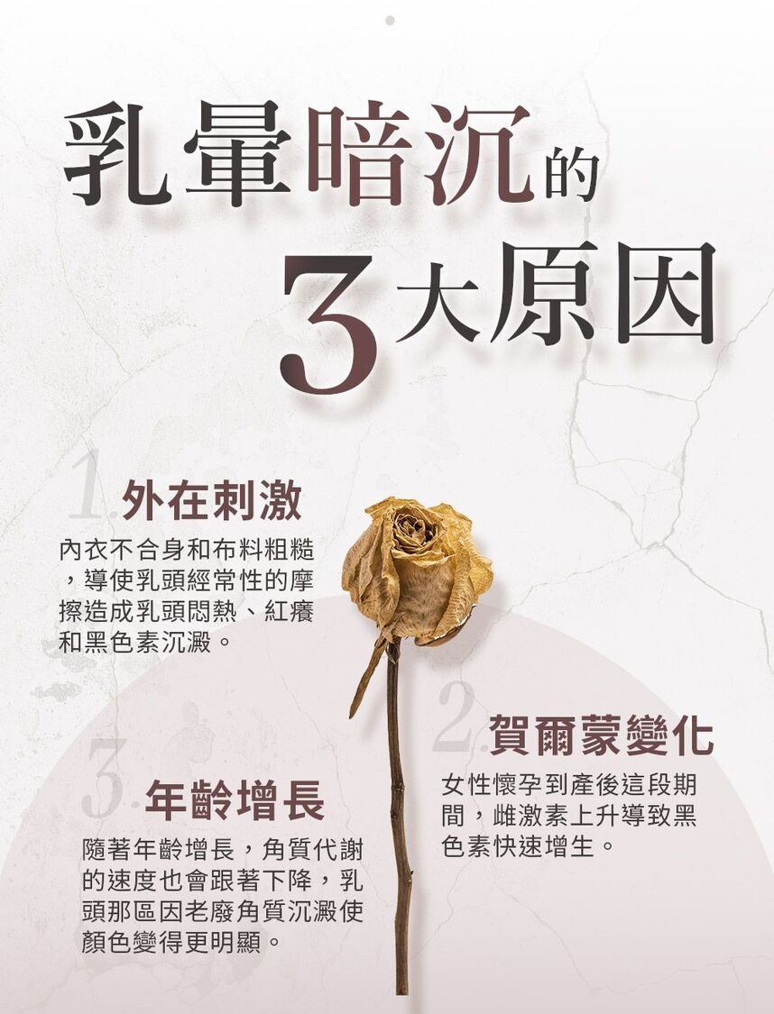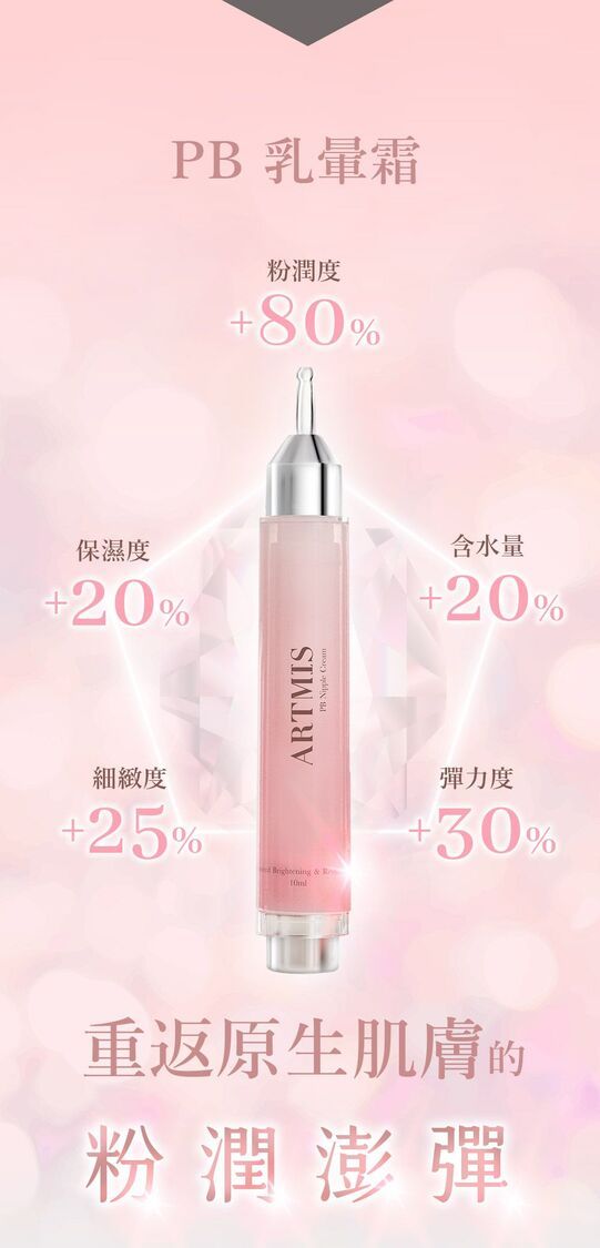 面對暗沉、乾癟的乳暈,PB 乳暈霜採用草本植萃,打造最安全速效的女神即視感。專利粉嫩配方,包括九大黃金美白胜肽,幫助均勻膚色、提亮和調整膚質;珍珠粉滋養潤澤皮膚、淡化膚色不均、提亮膚色、平衡油脂分泌;紫草根萃取舒緩肌膚不適感,美化胸部肌膚色澤,散發迷人光采。